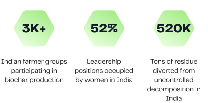 Carboneers engaged 3,041 farming communities in Assam and Odisha, India for a biochar initiative that has sequestered 180K tons of CO2. Not only are they locking away carbon for thousands of years, but they’re working closely with local farming group NGOs to strengthen community bonds and empowering women as team members across all levels of the project. 52% of the leadership positions are held by women.