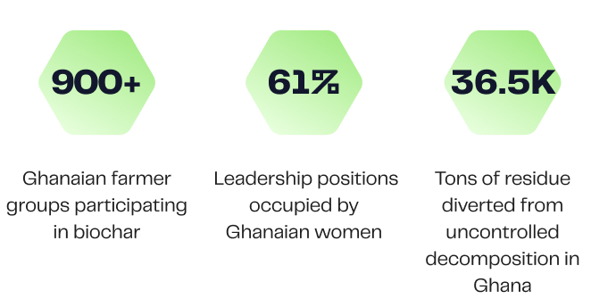 In the Volta, Upper West, Savannah, and Northern regions of Ghana, Carboneers has partnered with 866 farming communities for a biochar project that’s removed 30K tons of CO2 and has achieved a 61% female employment rate0. Farmers have also financially benefited from these carbon credits. 7,188 farming households have earned additional income through biochar production in this project. All this revenue is delivered via mobile money transfers ensuring a secure and transparent financial system.